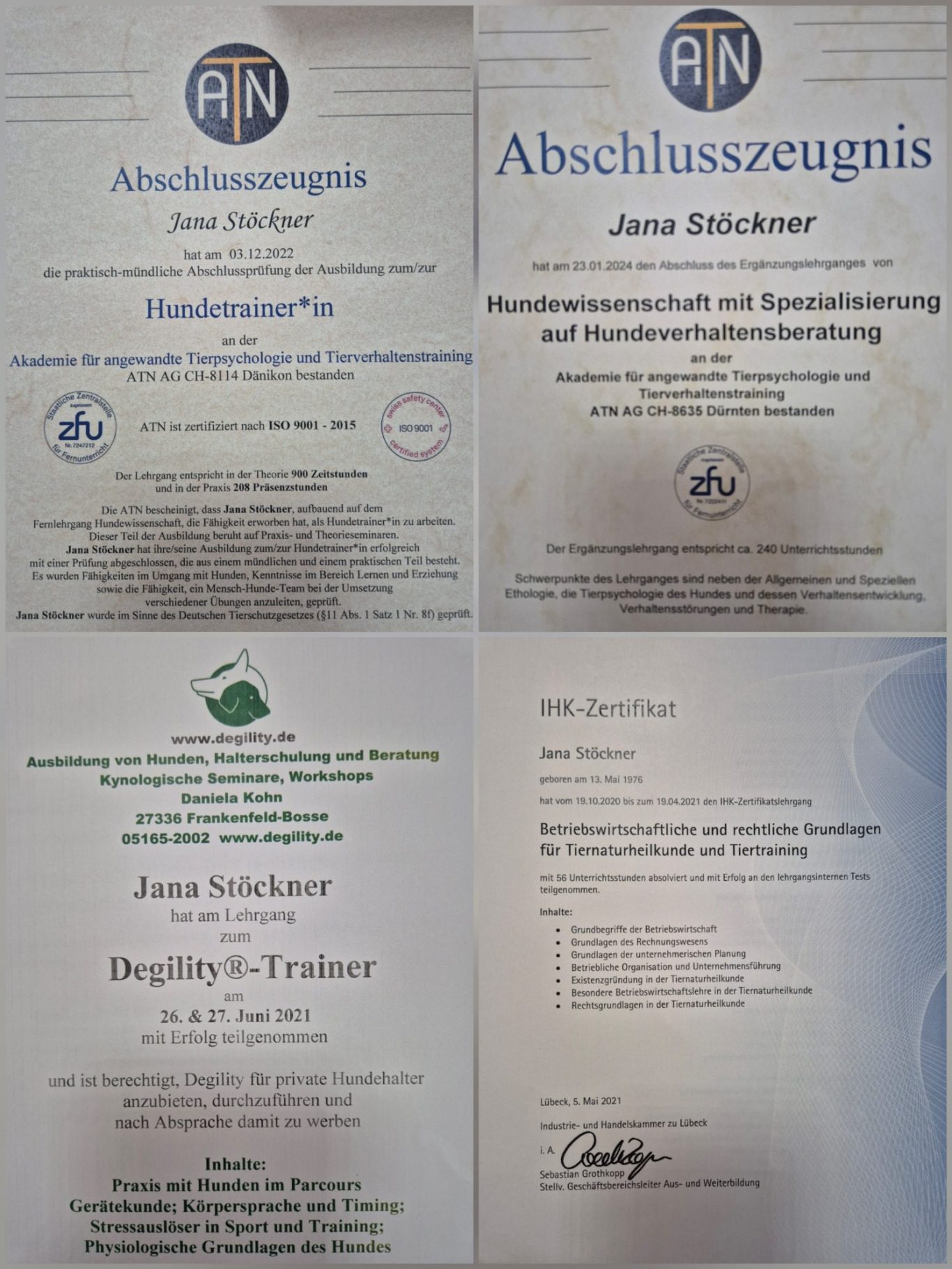 Zertifizierte Hundetrainerin gemäß §11 Abs. Nr. 1 8f TierSchG bei der ATN - Akademie für angewandte Tierpsychologie und Tierverhaltenstraining.